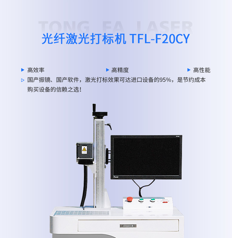 通發(fā)激光研發(fā)TFL-F20CY激光打標機,金屬材料和塑膠材料都進行打標加工,本激光鐳雕機配置成熟的20W和30W國產(chǎn)光纖激光器,國產(chǎn)振鏡、國產(chǎn)軟件,性價比高,激光打標效果可達進口設(shè)備的95%,是節(jié)約成本購買設(shè)備的信賴之選!