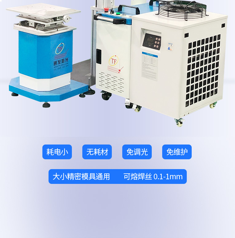 采用光纖激光器,反射率高,能量強,免維護,免調(diào)光,功耗少,相比傳統(tǒng) 模具焊來說,體積小,安全,穩(wěn)定性好超長使用壽命。 1000W光纖激光器,滿足銅、鋁焊接量大的模具及產(chǎn)品焊接加工需要。 高承重底座及工作臺,保持輕便靈活的優(yōu)點,同時提供更高承載能力。 配備.1.5P大功率一體式水冷水機,保證了大功率焊接的穩(wěn)定性。